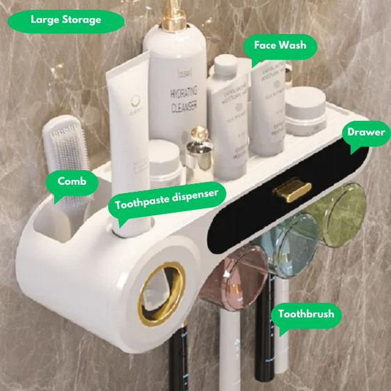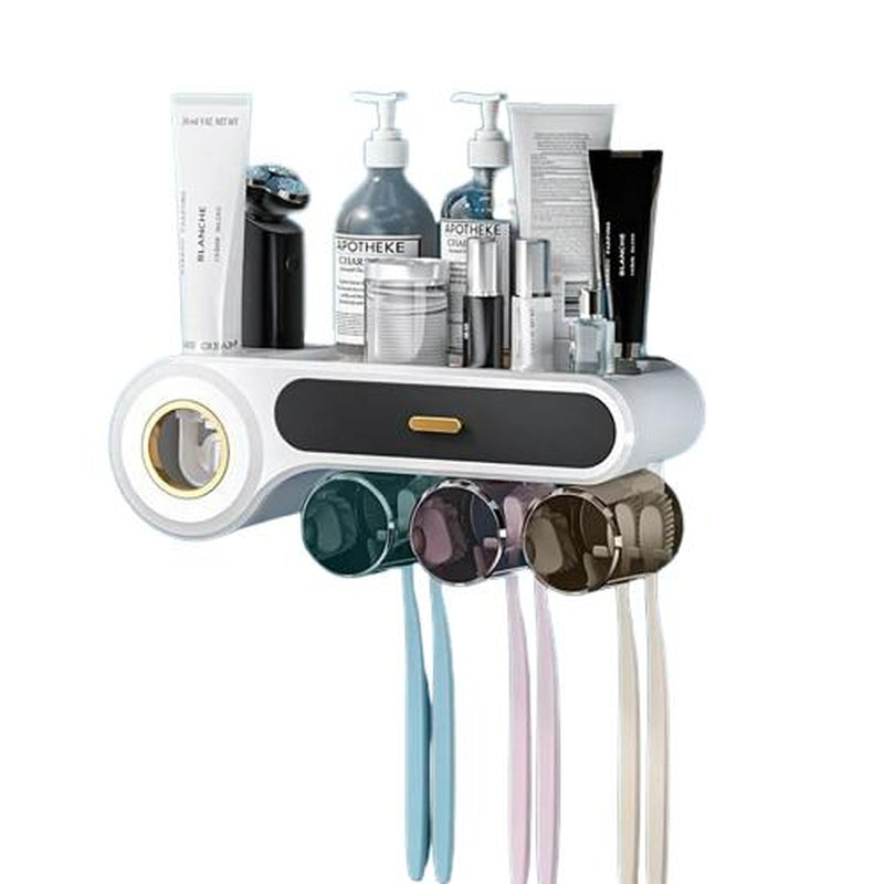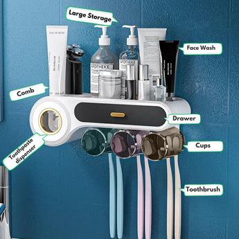 Organize & Simplify: Keep your bathroom neat with this 5-in-1 wall-mounted toothbrush holder and toothpaste dispenser. It includes a built-in toothpaste dispenser, three hanging cups, multiple toothbrush slots, and a small top shelf for accessories, making daily hygiene easy and clutter-free.