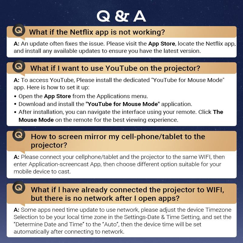 - Care: Keep projector lens clean; avoid direct sunlight and moisture
