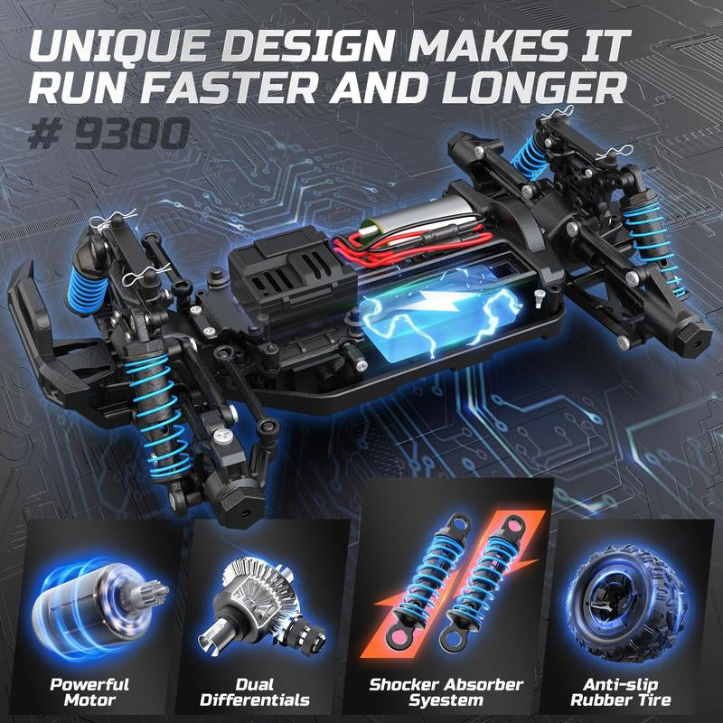 High-Speed Off-Road Adventure: The 9300 RC Car delivers thrilling performance with speeds up to 40 KM/H. Its 1:16 scale design and 4WD drivetrain make it perfect for tackling off-road terrains, from dirt and gravel to grass and sand, providing a true monster truck experience.