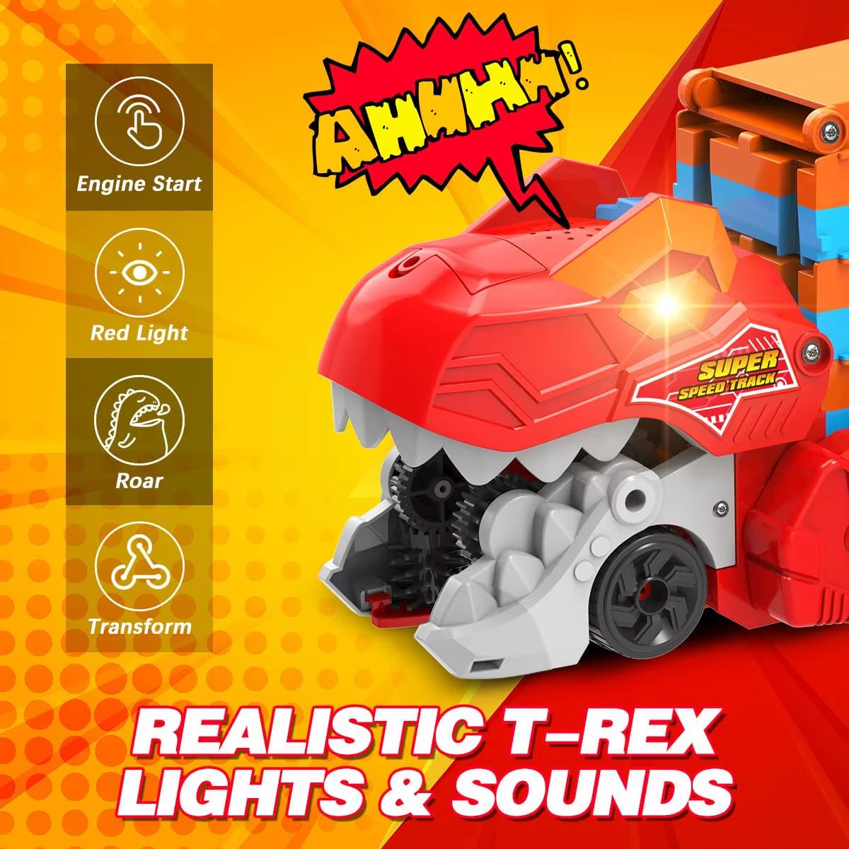 - Includes: 1 dinosaur truck, 8 mini race cars, foldable track